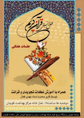 به گزارش روابط عمومی شبکه بهداشت و درمان قوچان جلسات هفتگی قرآن کریم دوشنبه های هر هفته ساعت ۱۸ در محل نماز خانه مرکز بهداشت قوچان برگزار میگردد.