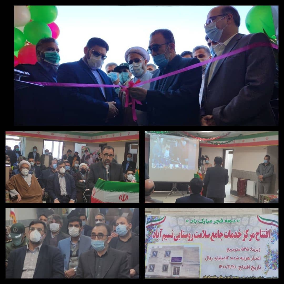 مرکز خدمات جامع سلامت روستایی نسیم آباد قوچان با حضور سردارنظری استاندار محترم خراسان رضوی، دکتر کیانی سرپرست محترم دانشگاه علوم پزشکی مشهد، دکتر سیدجواد حسینی رئیس مرکز بهداشت مشهد، امام جمعه،نماینده، فرماندار، مدیر شبکه بهداشت و درمان و جمعی دیگر از مسئولان قوچان طی ارتباط تصویری با آقای دکتر مخبر معاون اول محترم ریاست جمهوری به بهره برداری رسید.